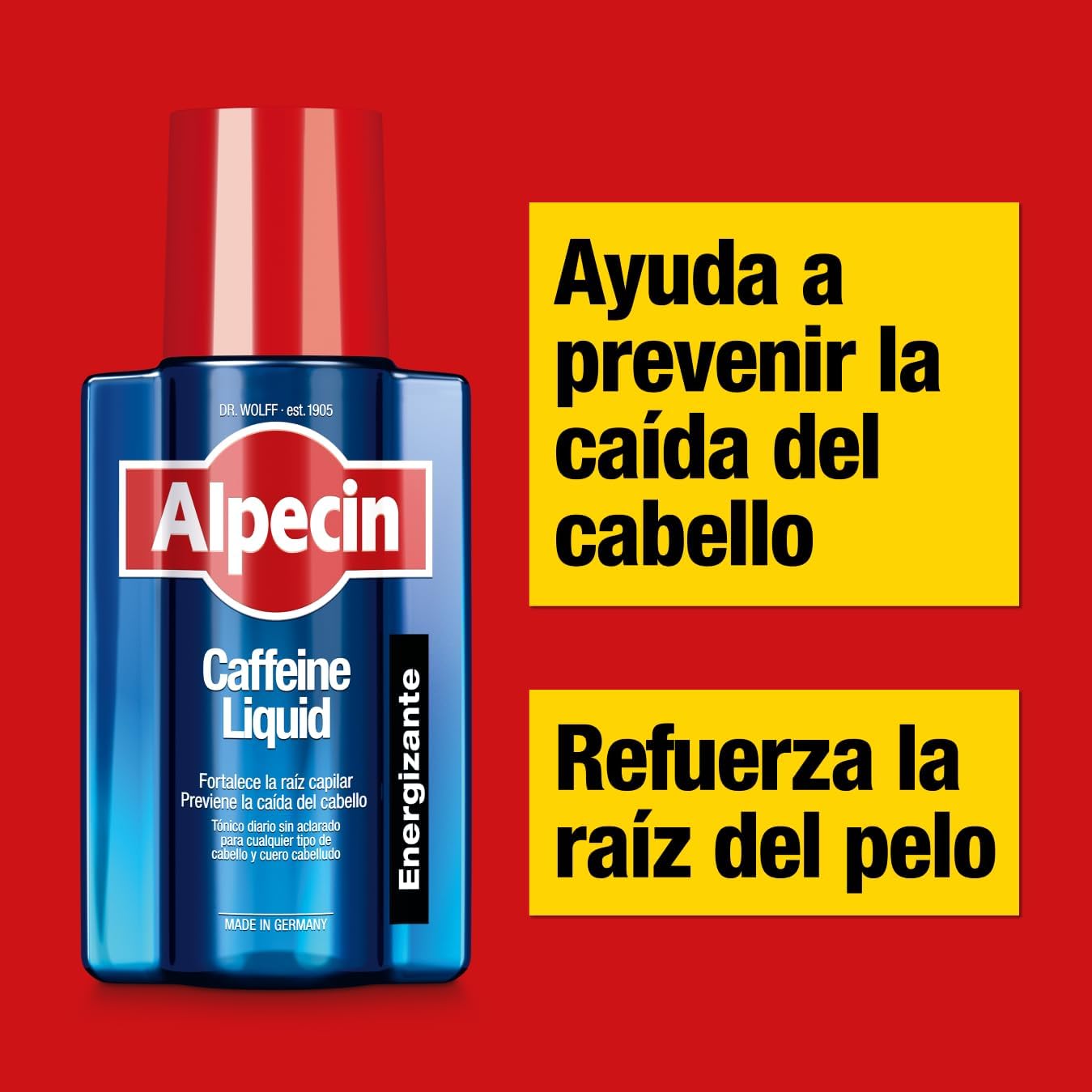 La cafeína promueve el crecimiento del cabello y se ha demostrado en numerosos estudios que retarda la pérdida de cabello hereditaria. La combinación de ingredientes activos van directamente a las raíces del cabello durante el lavado diario del cabello. En tan sólo 120 segundos, la cafeína viaja a lo largo del tallo capilar directamente hacia los folículos capilares. La cafeína activa las raíces del cabello, prolonga la fase de crecimiento y mejora el crecimiento del cabello. El zinc y niacina son importantes factores de crecimiento para las raíces del pelo sano.