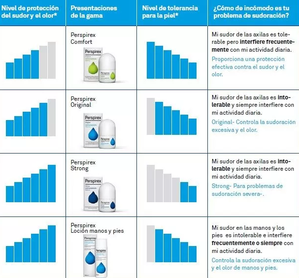 Perspirex Strong científicamente ha demostrado que elimina la sudoración excesiva (hiperhidrosis) y mal olor (bromhidrosis) en axilas por periodos de 3 a 5 días en cada aplicación, sin ninguna pérdida de eficacia y para el máximo confort. Su fórmula ha sido cuidadosamente desarrollada para su uso en la delicada piel de las axilas, minimizando la irritación que normalmente se asocia al cloruro de aluminio, ingrediente base de la formulación de los productos antitranspirantes. Es uno de los antitranspirantes más efectivos del mercado actualmente y brinda protección de alta resistencia contra la sudoración severa y mal olor.